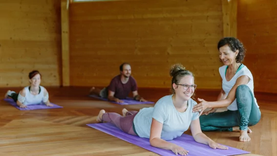 Nachmittags gibt's eine sanft dynamische und ruhigere Praxis mit längerem Verweilen in einer Haltung.